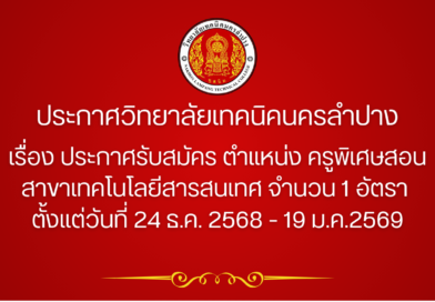 ประกาศวิทยาลัยเทคนิคนครลำปาง เรื่อง ประกาศรับสมัคร ตำแหน่ง ครูพิเศษสอน สาขาเทคโนโลยีสารสนเทศ จำนวน 1 อัตรา ตั้งแต่วันที่ 24 ธ.ค.-19 ม.ค.2569